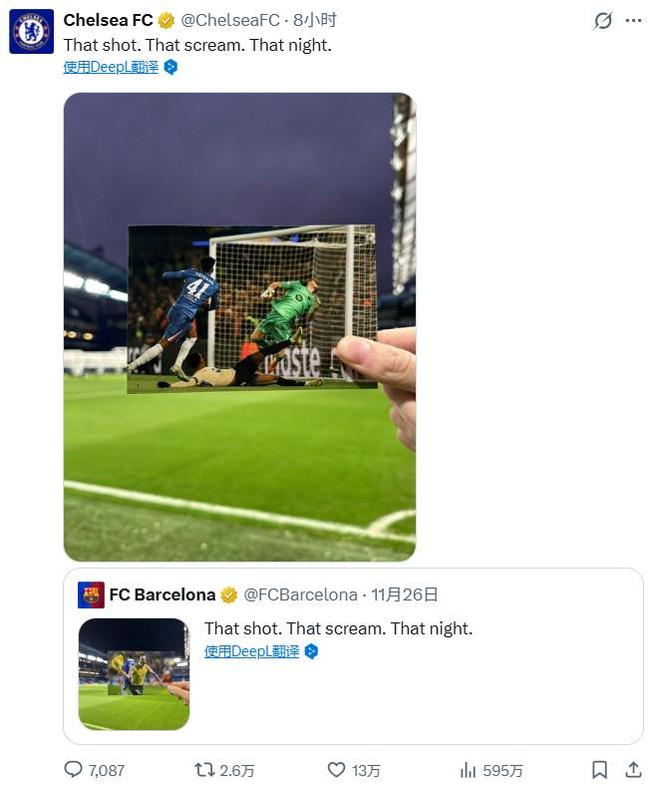 然而,两天后,切尔西却用一条动态回应了巴萨的推文。蓝军发布了一则完全相同的文案,但配图却是埃斯特旺攻破巴萨球门时的瞬间。
